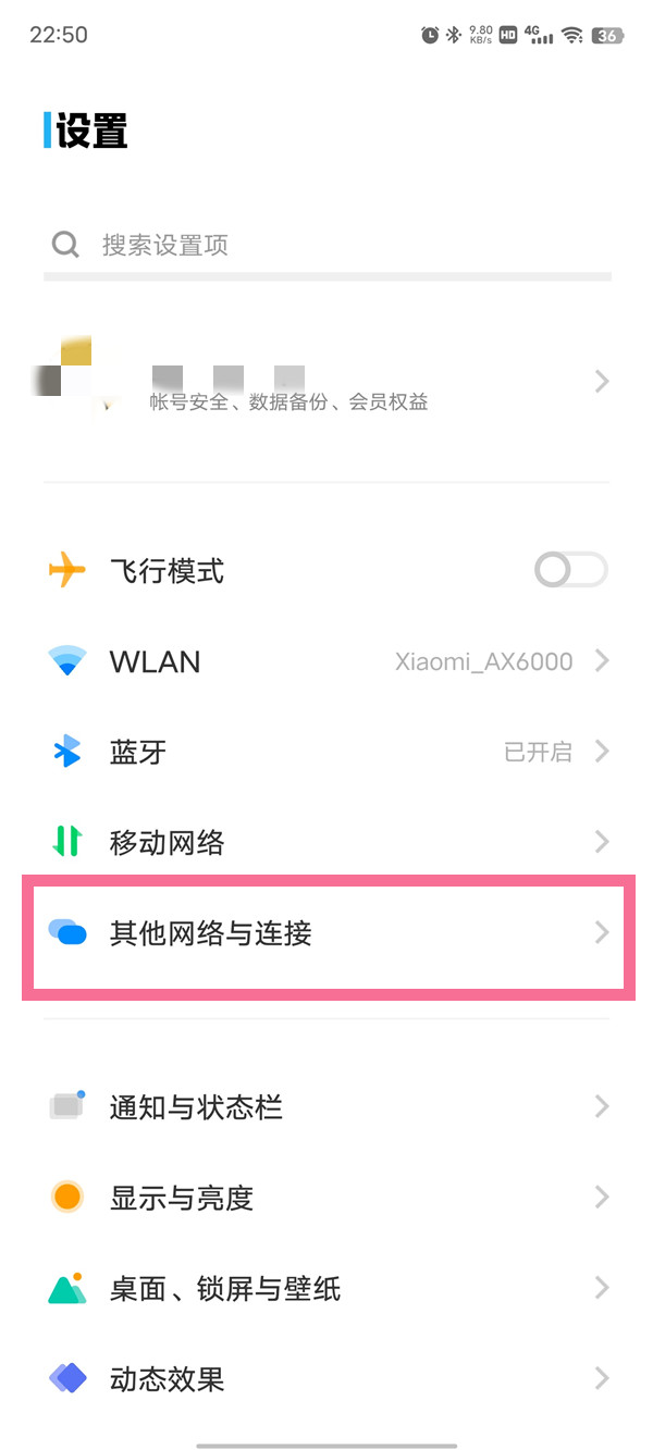 1、在手机设置菜单中点击【其他网络与连接】。