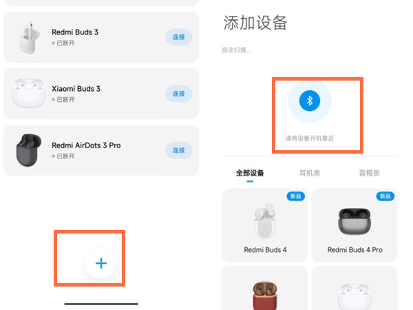 2、再点击下面的添加图标,将耳机开盖靠近手机即可连接。