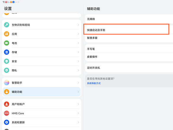 1、在平板辅助功能设置中点击【快捷启动及手势】。