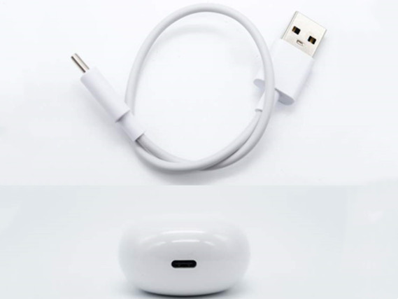 2、为充电盒充电:使用包装内含的Type-C充电线为充电盒充电。充电时白色指示灯长亮,充电完成白色指示灯熄灭。