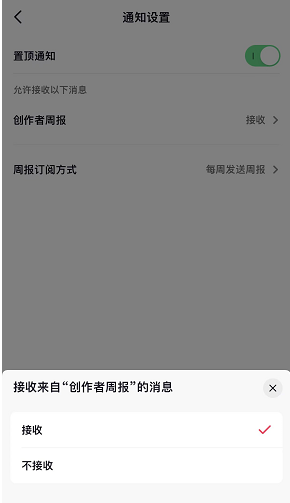 4、这里有置顶通知、周报订阅方式和创作者周报功能,点击“创作者周报”,将功能设置为“接收”就可以了。