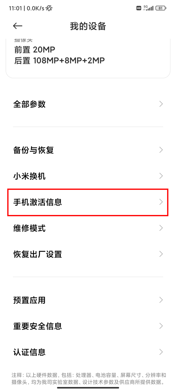 2、下拉找到并点击【手机激活信息】选项。