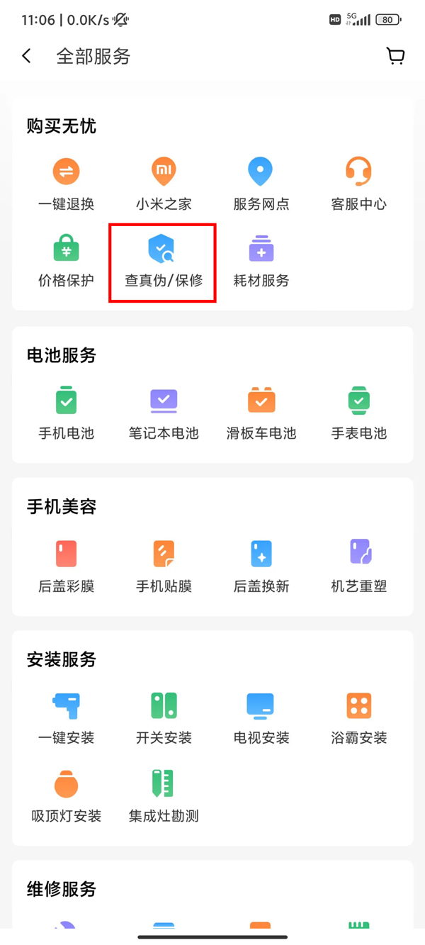 2、点击【查真伪/保修】。