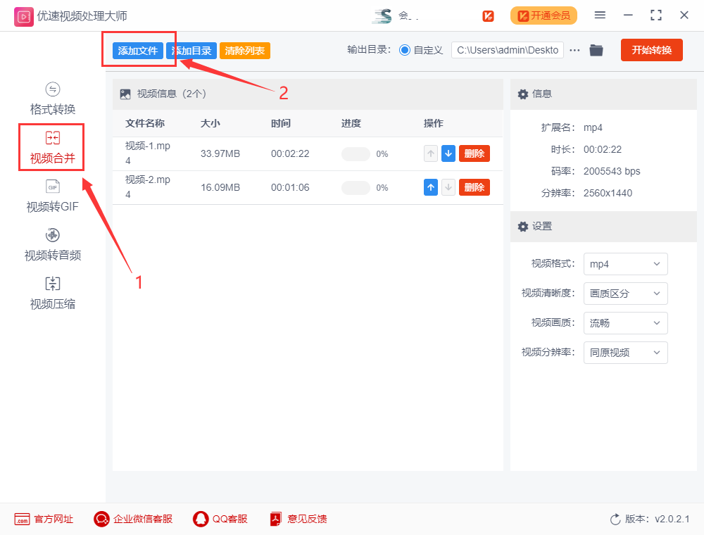 流程二:如图示例,我们可通过文件尾部的蓝色箭头,调整文件的上下顺序,软件会按照从上到下顺序进行合并。然后点击右列表的“视频格式”设置合并后的格式,小编建议大家选择兼容性较好的“mp4”格式。
