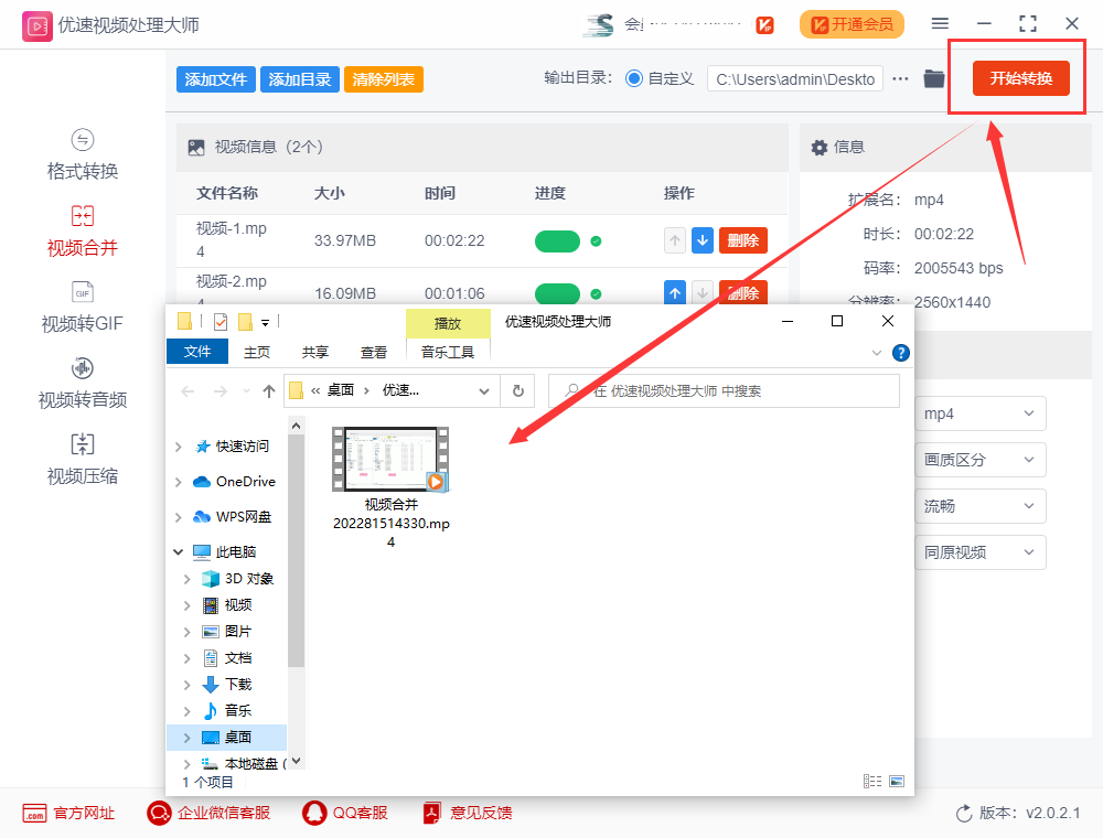 流程三:最后点击右上的红色“开始转换”按钮,视频开始合并。合并完成后在系统自动弹出的输出文件夹中可查看合并后的视频文件;