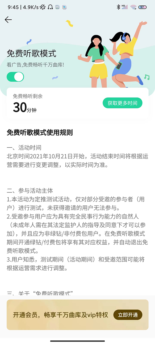 用户选择开启免费听歌模式后,在免费听歌有效期间可以畅听特定会员歌曲的完整版(即原本未开通会员时只能试听30秒/60秒的歌曲,进入免费听歌模式后可以听完整全曲),但不包含数字专辑、数字音乐单曲、会员长音频等内容,同时,用户知悉,基于版权方要求,部分属于免费听歌范围的歌曲将可能需要另外支付费用或办理会员。具体免费听歌范围以歌曲页面提示为准。