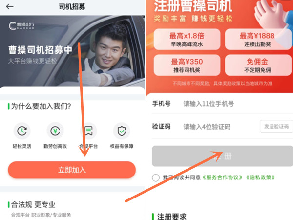 2、点击立即加入,再填写手机号和验证码点击注册完成申请即可。