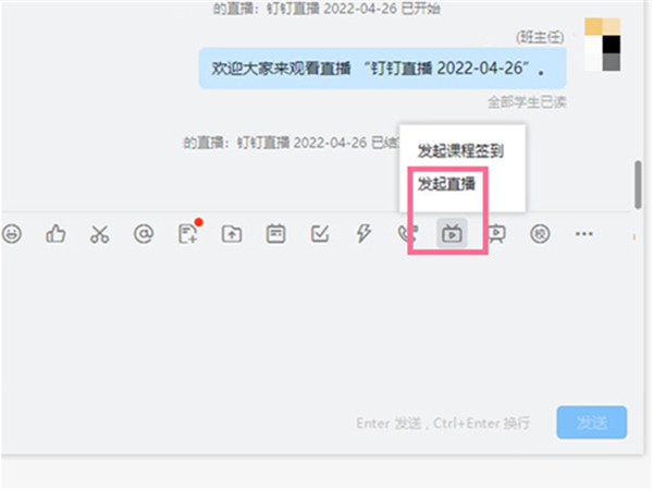 1、打开钉钉聊天对话框,点击直播图标,选择【开始直播】。