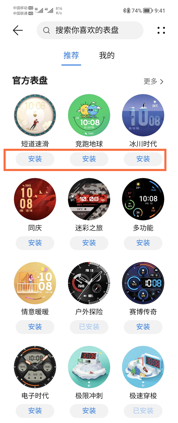 2、选择喜欢的表盘,点击下方的安装即可。