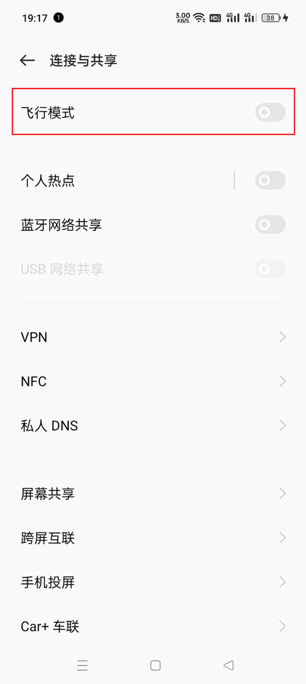 也可以从屏幕顶部往下拉,划出状态栏,点击飞行模式按钮即可。