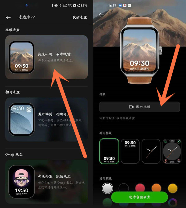 2、点击视频表盘,点击添加视频,选择需要设置的视频表盘,再点击设为当前表盘即可。