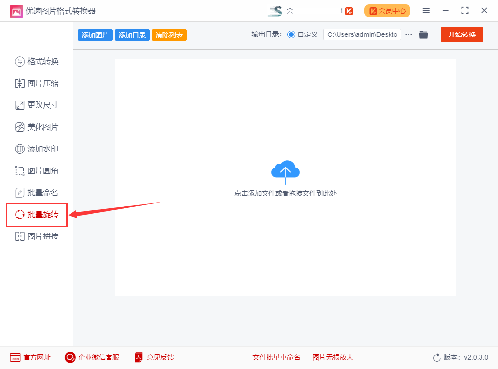 如下图所示,先在电脑上安装需要使用的“优速图片格式转换器”软件工具,左边是软件功能菜单,一共九个功能,我们根据需求选择【批量旋转】功能选项。