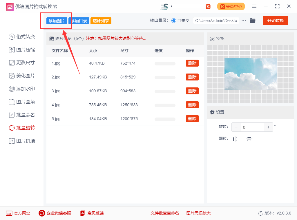 点击【添加文件】按钮,将需要调整角度的图片添加到软件中,也可以用鼠标将图片拖到软件里进行添加,效果是一样的。