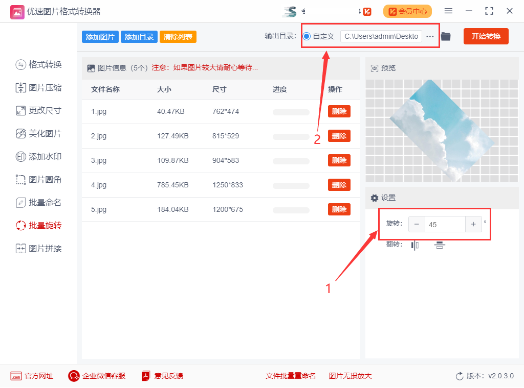 如下所示,先在软件右下方设置旋转角度,顺时针旋转则设置成45°,逆时针旋转则设置成-45°;然后再设置输出目录文件夹,用来保存处理后的图片。