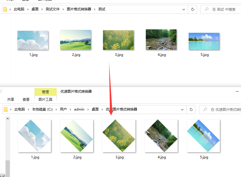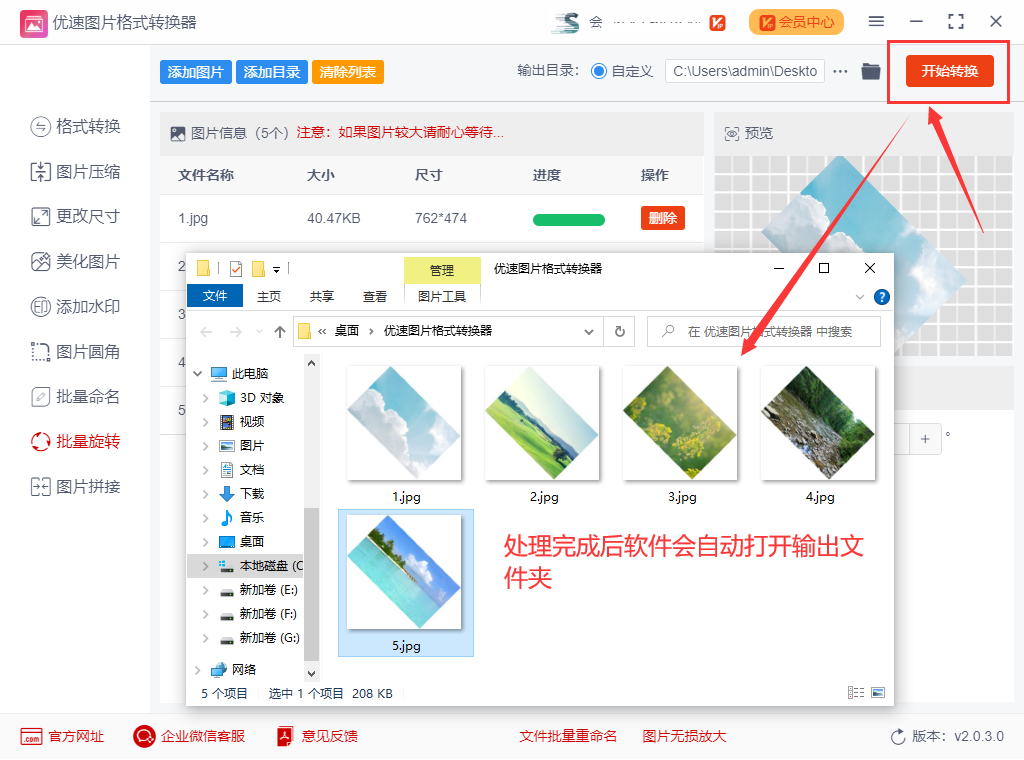 完成设置后点击【开始转换】红色按钮,当所有图片完成调整后软件会自动打开输出文件夹,可以看到调整角度后的图片全部保存在这个文件夹里。