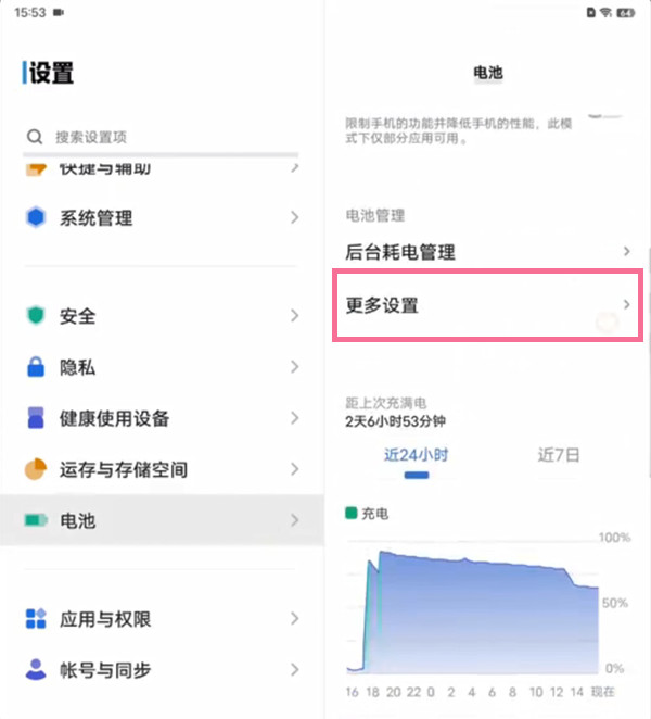 1、在手机设置菜单中点击【电池】,进入【更多设置】。