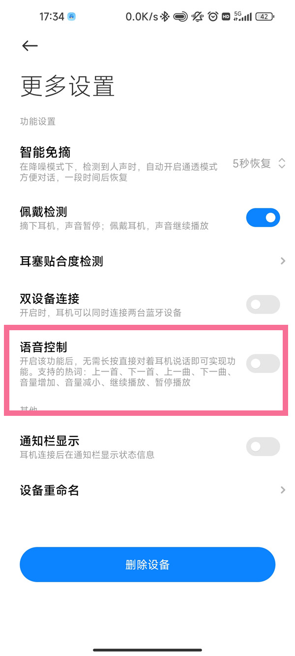 2、开启【语音控制】后,对着耳机说上/下一首或者上/下一曲即可切歌。