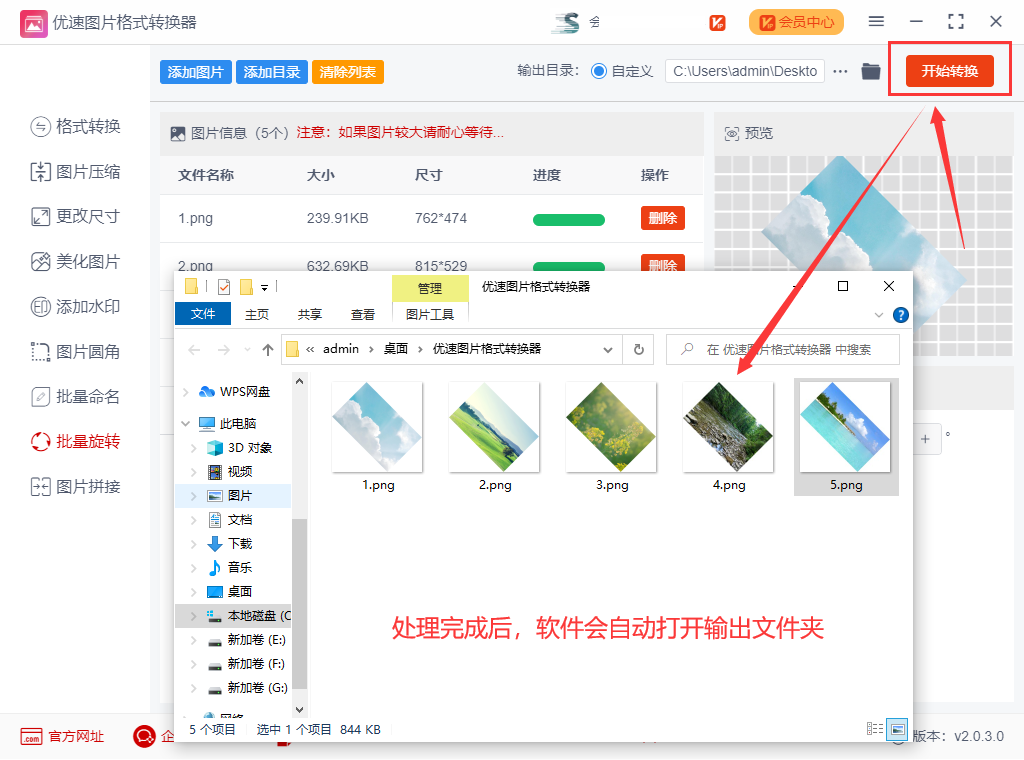 第四步,设置完角度后点击软件右上角【开始重命名】红色按钮启动软件,稍微等待一小会,所有图片完成旋转后,软件会自动打开输出文件夹,方便我们查看旋转后的图片。