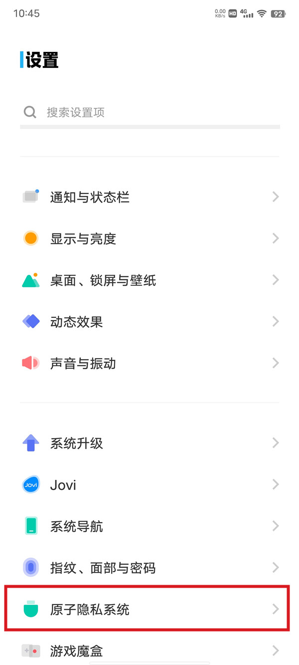 1、打开手机设置,点击【原子隐私系统】。