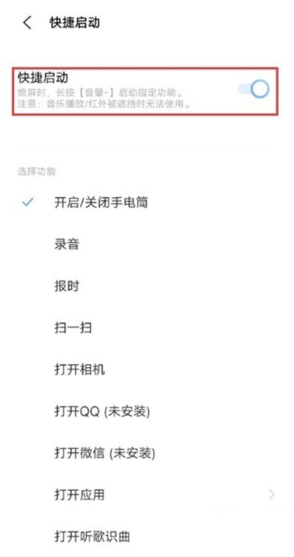 打开手机设置,点击快捷与辅助,再点击快捷启动,将快捷启动开关开启,勾选开启/关闭手电筒,在熄屏状态下长按音量减键可快速打开手电筒。