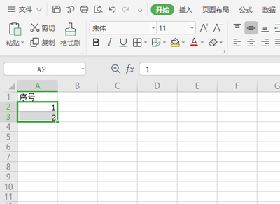 1、同样的方法,找到你想要下拉排序的表格区间,在区间第一格填入数字“1”,第二格填入“2”;
