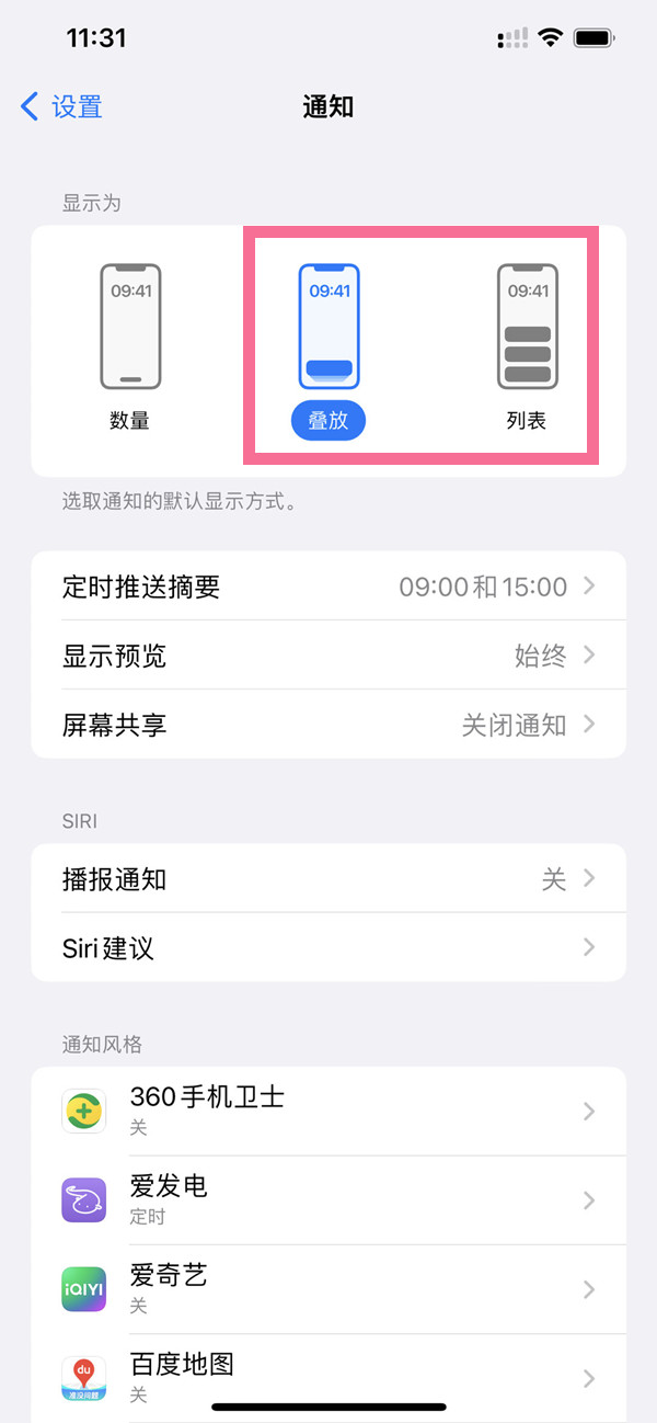 2、在通知显示中将叠放改为【列表】即可。