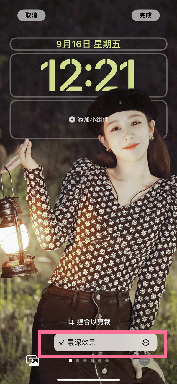 3、点击右下角的三个点,勾选景深效果,双指移动壁纸调节到遮挡位置即可。