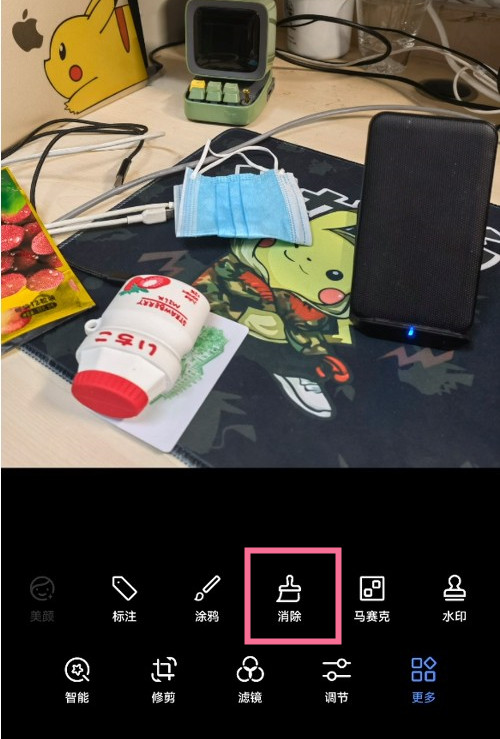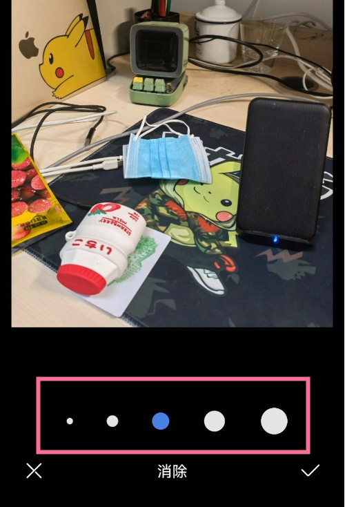2、进入更多>消除,根据想要消除的对象选择合适的画笔大小,对其进行涂抹并覆盖完成点击保存即可。