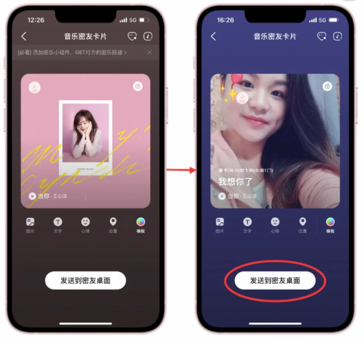 第一步,打开网易云APP,随机点开一首歌,然后点击右上方的分享按钮,然后点击下图中的【发送至密友桌面】按钮;