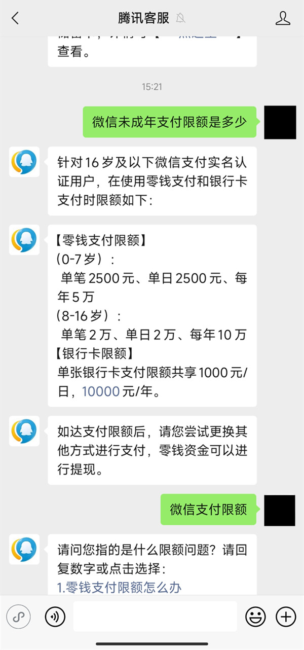 16岁及以下微信支付实名认证用户,在使用零钱支付时,0-7岁用户单笔2500元、单日2500元、每年5万,8-16岁用户单笔2万、单日2万、每年10万,单张银行卡支付限额共享1000元/日,10000元/年。