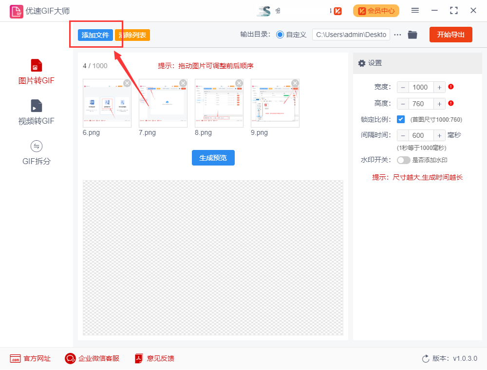 步骤2,点击【添加文件】蓝色按钮,将需要做成gif动图的图片添加到软件中,添加成功后图片会显示在软件上,鼠标拖动图片可以调整前后位置。