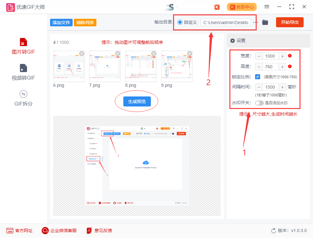 步骤3,先设置合成后gif动图的宽度和高度尺寸大小,以及每张图片之间的间隔时间,可以生成预览对效果进行查看;然后再设置输出目录文件夹,用来保存做成的gif动图。
