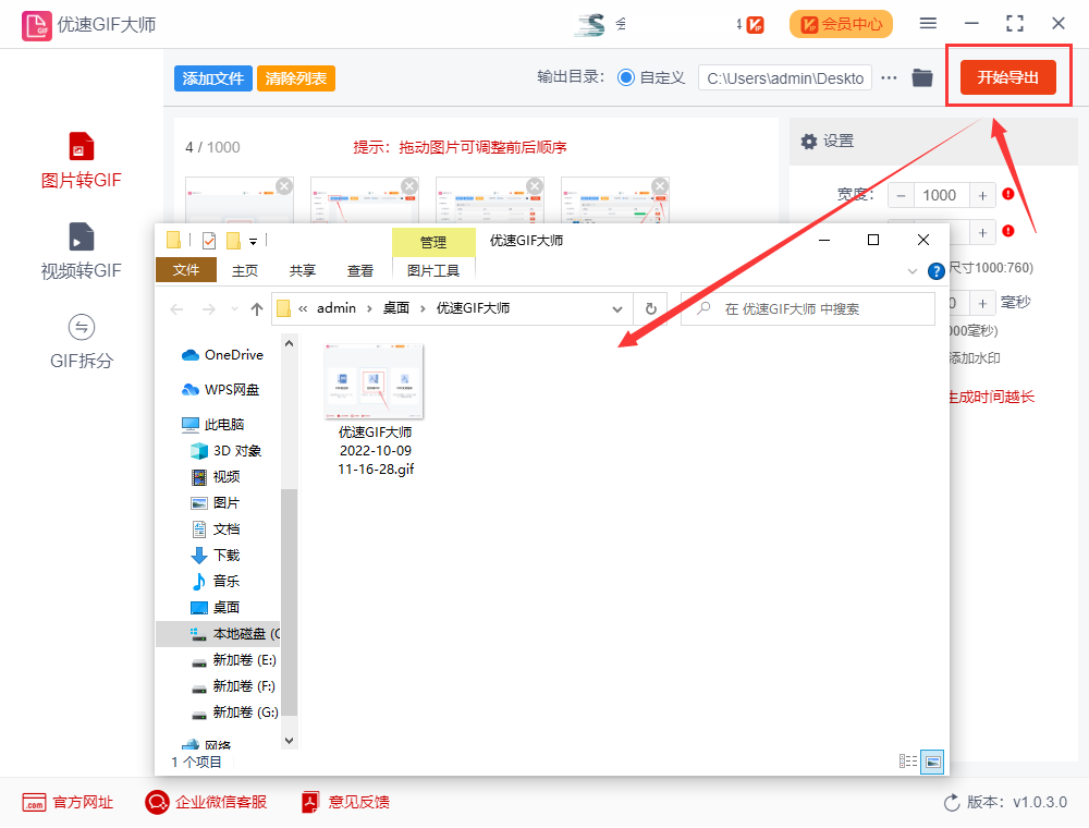 步骤4,最后我们点击【开始导出】红色按钮,这样就开启软件程序了,完成gif制作后软件会自动弹出输出文件夹,方便我们查看做好的gif动图。