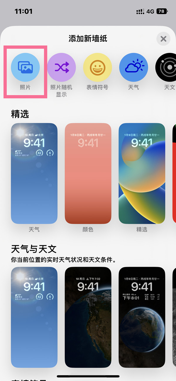 2、在添加新墙纸界面,点击上方的照片,选择需要设置的壁纸。