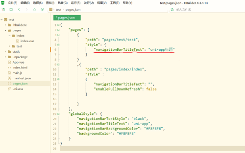 第二步:然后打开pages.json文件,其中navigationBarTitleText属性为标题属性。