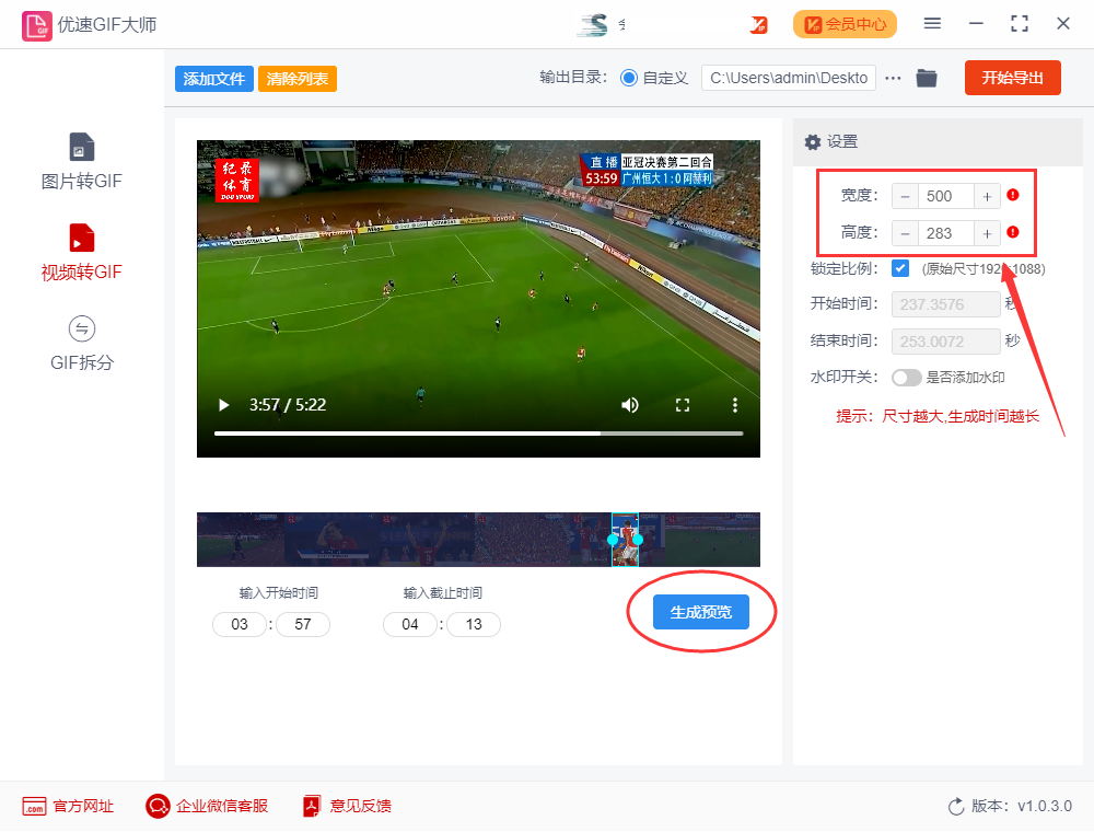 设置转换后gif动图的尺寸(宽度和高度);然后点击左边的【生成预览】蓝色按钮,这样我们对gif动图进行预览,不满意就继续调整,直到自己满意为止。