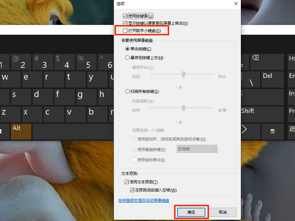 3、然后在设置界面中,找到‘打开数字小键盘’,在‘打开数字小键盘’前面打上勾,随后点击确定。