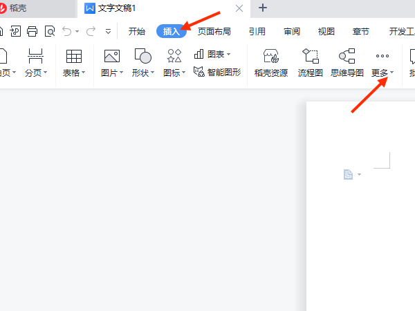 1、打开word,在插入选项下点击更多。