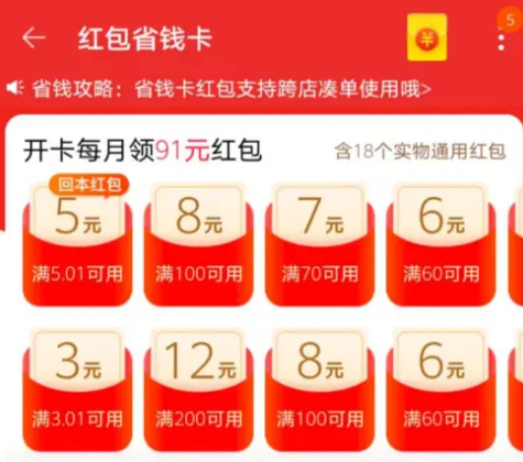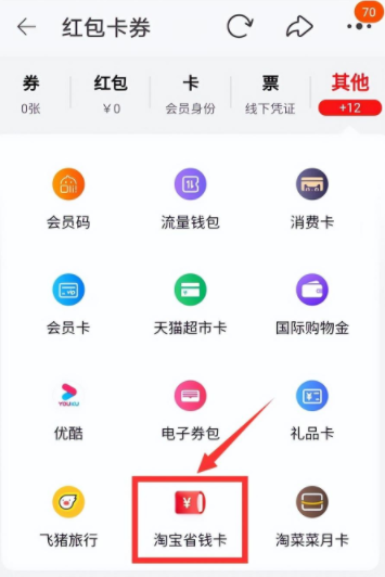 小提示:如果你的淘宝省钱卡入口不见了,点击我的淘宝>红包卡券>其他,可以找到入口。