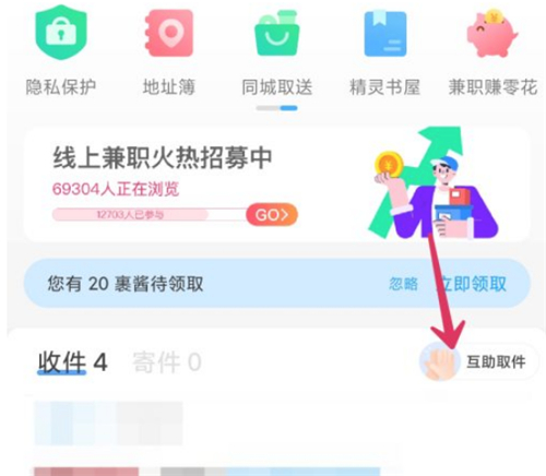 1、打开手机菜鸟app,在首页点击互助取件。