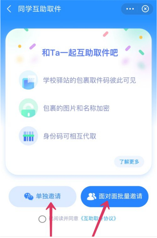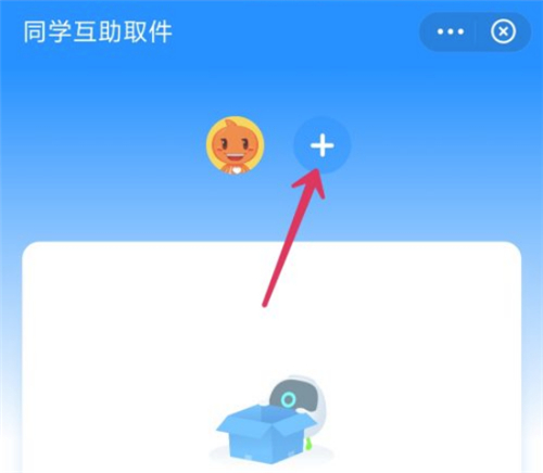 2、在互助取件页面,点击+号,选择一个邀请方式,邀请好友进行取件即可。