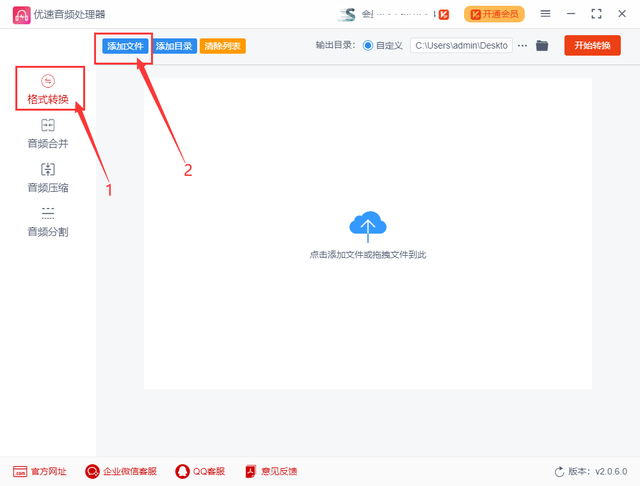 步骤1,打开电脑后下载并安装“优速音频处理器”软件工具,打开后选择左边的【格式转换】功能选项,然后点击左上方的【添加文件】蓝色按钮,将需要转换的aac音频文件全部导入到软件中。
