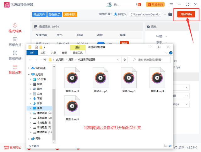 步骤3,点击右上角的【开始转换】按钮,启动音频格式转化。完成转换后软件会自动打开输出文件夹,我们可以看到所有转换成的mp3文件全部保存在这里。