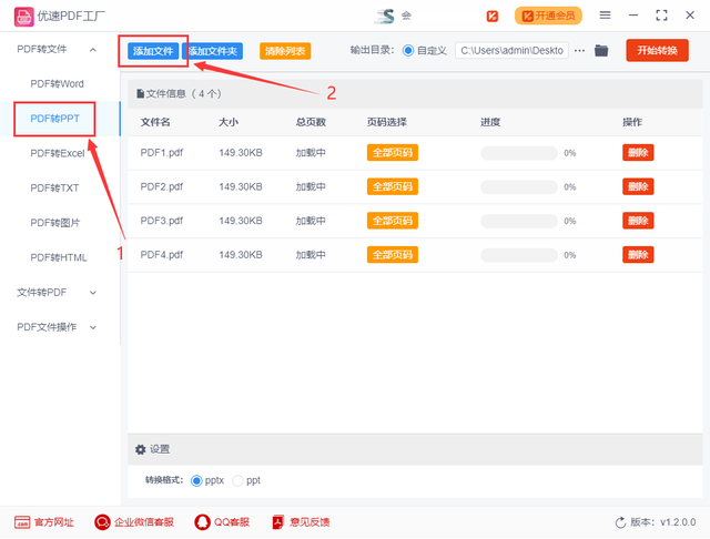 步骤2,在左边找到并点击【PDF转ppt】功能,然后点击【添加文件】按钮,将需要转换的pdf文件全部导入到软件,导入成功后pdf文件名会显示在软件上。