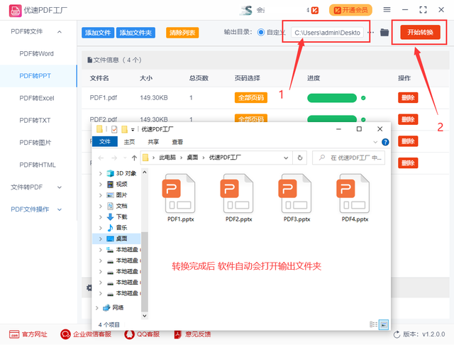 步骤3,先设置输出目录,用来保存转换成的ppt文件;然后点击右边的【开始转换】红色按钮启动转换,完成格式转换后软件会自动打开输出文件夹,转成的ppt文件就保存在这里哦。