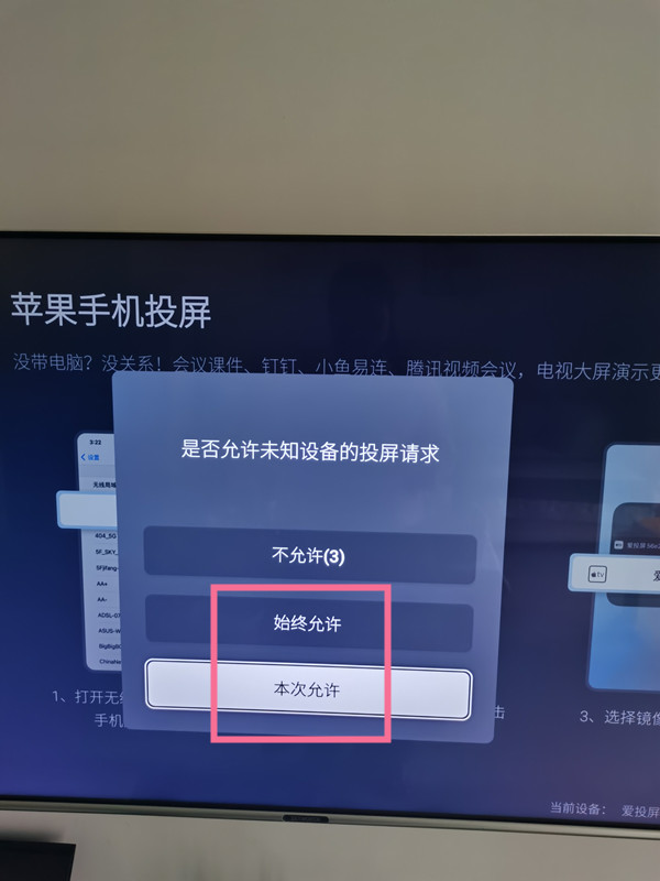 2、点击需要投屏的电视名称,在电视上允许投屏请求即可。