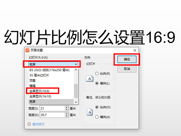 3、点击幻灯片大小的选择框,选择【全屏显示16:9】,点击【确定】。