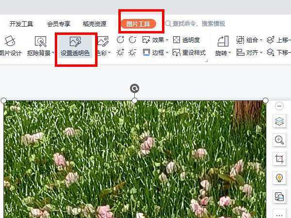 2、点击插入的图片,在【图片工具】下点击【设置透明色】,在图片需要设置透明的地方点击即可。