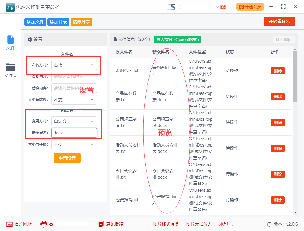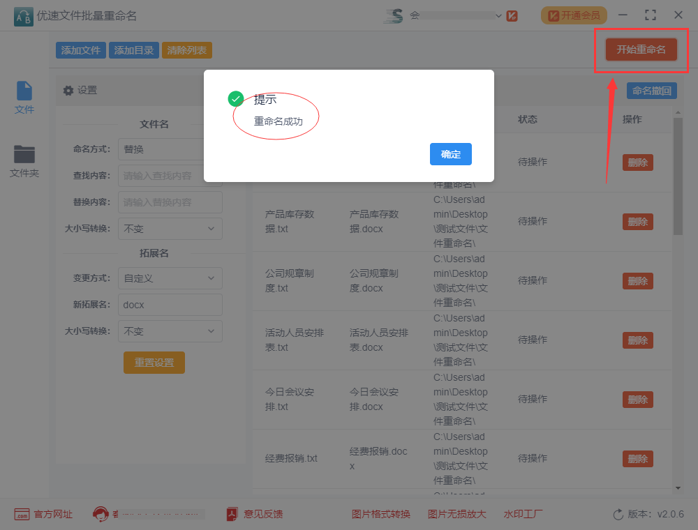 第4步,点击软件右上角【开始重命名】功能按键,这样就启动软件了,稍等片刻,当软件弹出“重命名成功”的提示后,说明所有文件的拓展名已经修改完成。