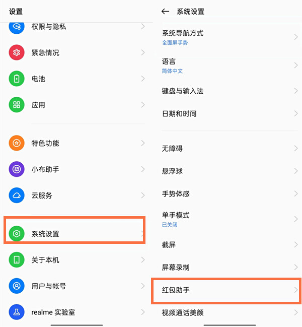 1、打开手机设置,点击系统设置,再点击红包助手。